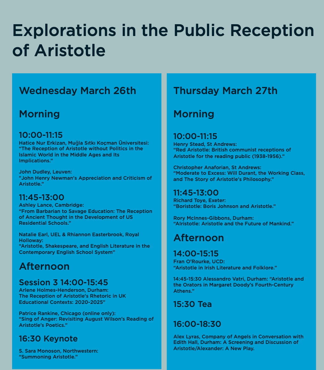 On March 26 and 27, we welcomed speakers and delegates for our international conference, "Explorations in the Public Reception of Aristotle", supported by the the Classics and Ancient History Department, Institute of Classical Studies and the Durham Centre for Classical Reception.
